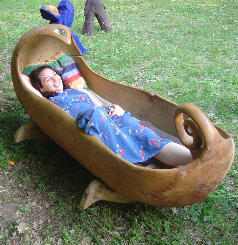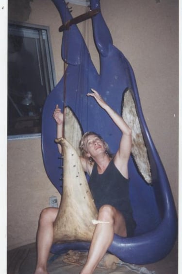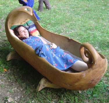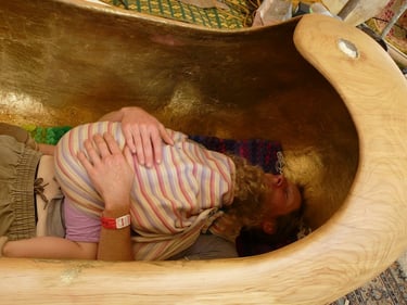 "J'ai aussi créé un berceau pour adulte selon les mêmes principes qui offre un contenant aux autistes (prêté à l'IME de Léran (09)) ou un caisson sensoriel pour se retrouver, ainsi qu'une harpe pour les sourds dans laquelle ils peuvent entrer pour jouer avec les vibrations du son et nous pouvons les écouter..."