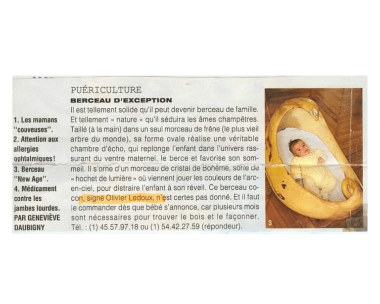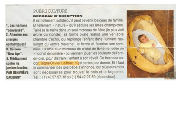 "Depuis la création du premier berceau, une trentaine d'autres ont vu le jour. Je ne compte plus les témoignages de joie maternelle et enfantines, de grand-mères aussi qui sentent des envies de grossesse à la vue de ce berceau, petit bateau, porteur de vie..."